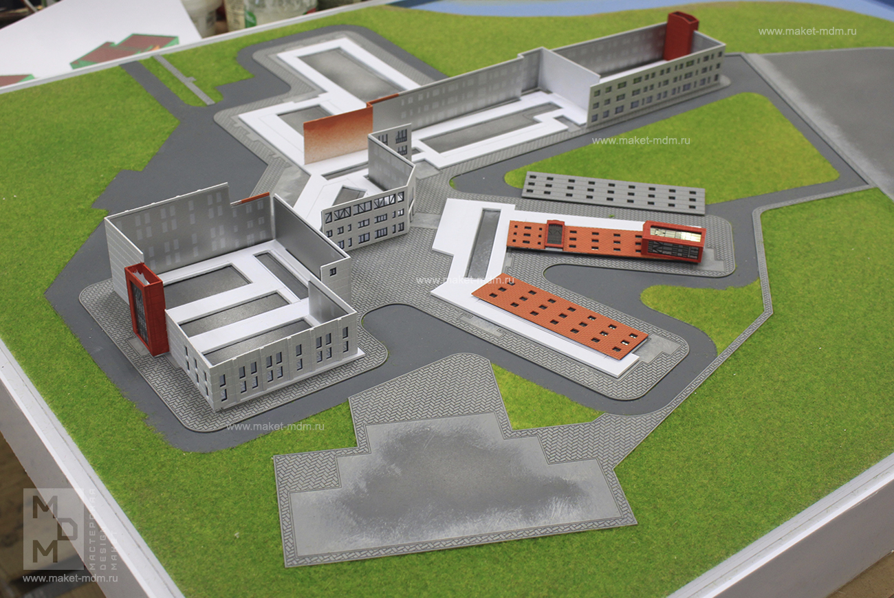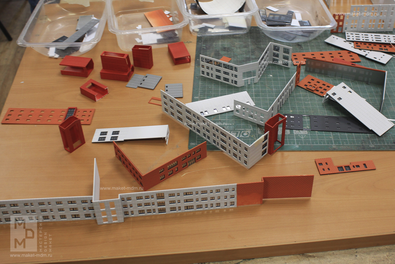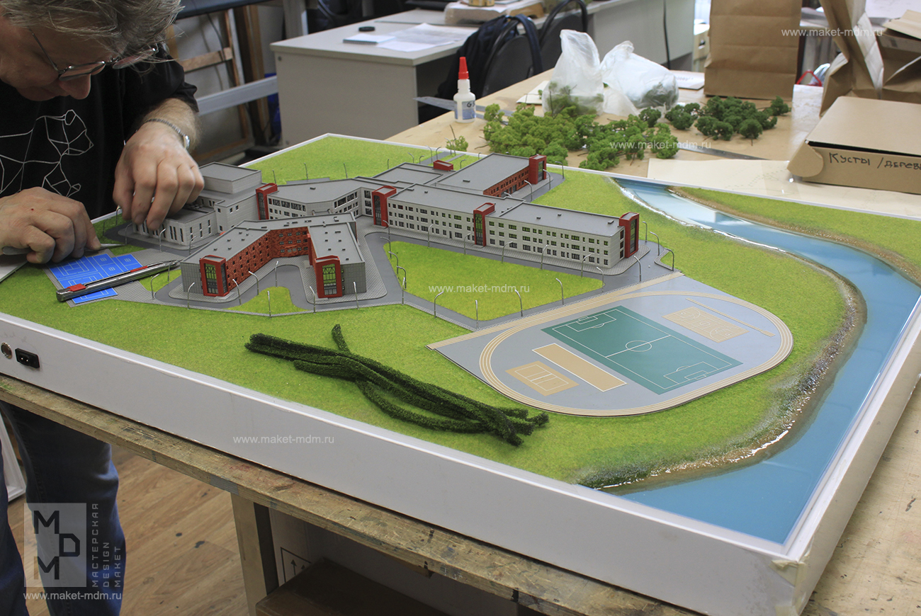 Сегодня мы хотим поделиться фотографиями процесса работы над макетом образовательного комплекса (школы) в масштабе 1:375. Несмотря на небольшой масштаб, мы постарались проработать фасады здания максимально детализировано. В макете предусмотрена внутренняя светодиодная подсветка.